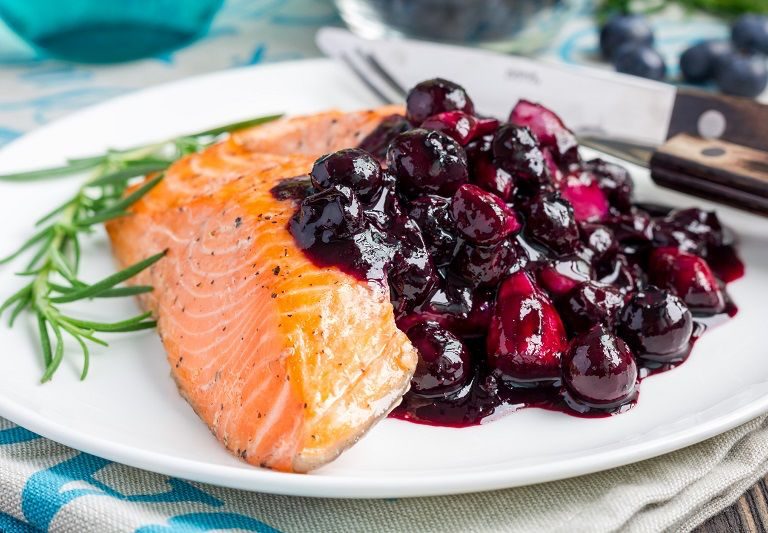 Một bát ngũ cốc rực rỡ đặt ở trung tâm đĩa, được chế biến xung quanh món cá hồi áp chảo với nước sốt việt quất gừng vùng British Columbia, dùng kèm...